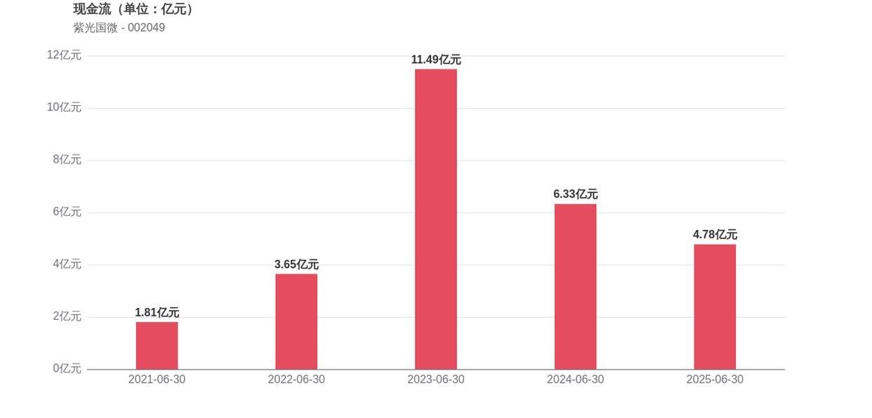 在经营稳健性方面,紫光国微面临存货管理效率大幅提升但现金流表现不佳的局面,存货周转天数为260.12天,较2024年上半年下降了89.67%,表明存货管理效率显著改善。经营活动产生的现金流净额为4.78亿元,相比2024年同期的6.33亿元,同比下滑了1.55%,显示出现金流创造能力有所减弱。此外,2025年上半年的资产负债率为27.23%,同比下降了0.28个百分点,这意味着公司负债总额占资产总额的比重在减少,财务杠杆水平有所降低。