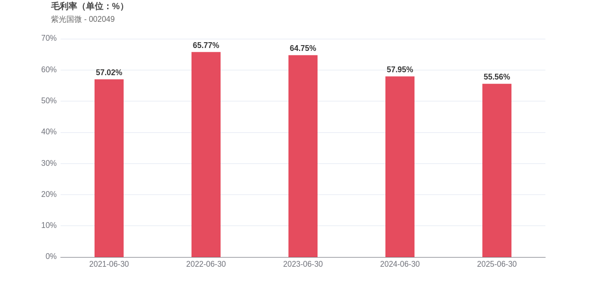 从反映盈利质量的指标来看,紫光国微的盈利能力出现明显下滑。净利率由2024年上半年的25.88%下滑至22.71%,下降了3.18个百分点,已连续3年同期下滑。毛利率从2024年上半年的57.95%下滑至55.56%,下降了2.40个百分点,已连续3年同期下滑。净资产收益率方面,2025年上半年为5.44,同比下降了0.74个百分点,已连续3年同期下滑。