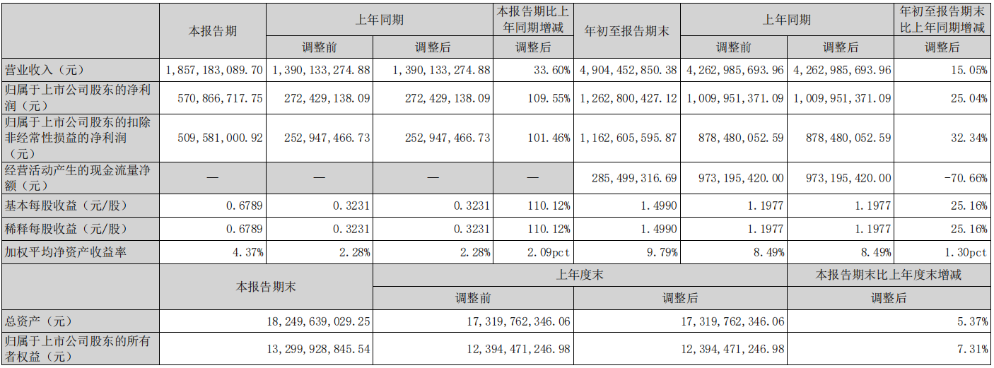 年初至报告期末,公司累计实现营业收入49.04亿元,较上年同期增长15.05%;归属于上市公司股东的净利润12.63亿元,同比增长25.04%;归属于上市公司股东的扣除非经常性损益的净利润11.63亿元,同比增长32.34%。基本每股收益与稀释每股收益均为1.499元/股,同比增长25.16%;加权平均净资产收益率9.79%,同比增加1.3个百分点,盈利能力持续优化。