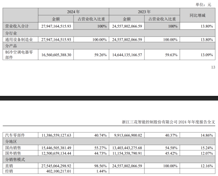 结合招股书与三花智控2024年年报数据,2022年、2023年、2024年,制冷空调电器零部件的收入占比分别为64.8%、59.63%、59.26%;汽车零部件业务收入占比分别为35.2%、40.37%、40.74%。
