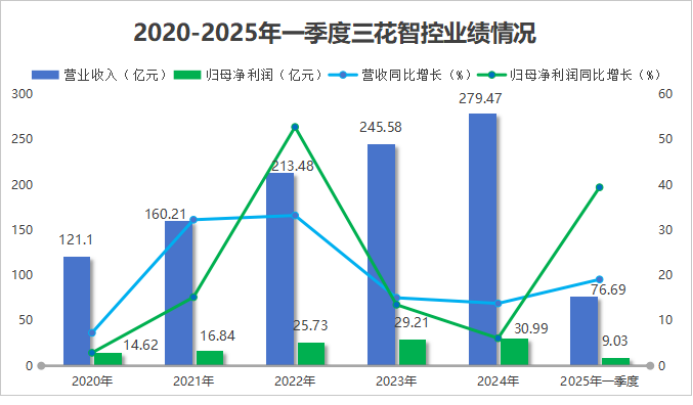 2020年,三花智控营收仅有121.1亿,到了2024年就已经攀升到了279.47亿,年复合增长率达23.25%。