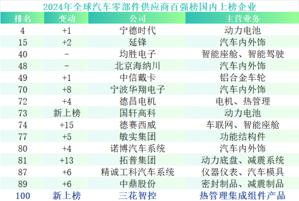 目前,2024年全球汽车零部件供应商百强榜重磅揭晓,国内15家企业强势上榜,宁德时代稳坐全球前五。