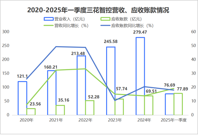 随着业绩的增长,三花智控的应收账款也呈现出水涨船高的态势。财报数据显示,2020-2024年,公司应收账款从23.56亿元飙升至69.51亿元。