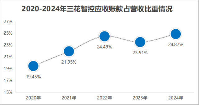 2020-2024年,三花智控应收账款年复合增速高达31.06%。当然,应收账款增速高并不必然导致其风险高,还要看应收账款增速与营收增速的匹配情况。