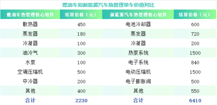 相较于燃油车,新能源汽车新增冷却板、电池冷却器、电子水泵等部件,热管理单车价值量提升近2倍,达到6410元。