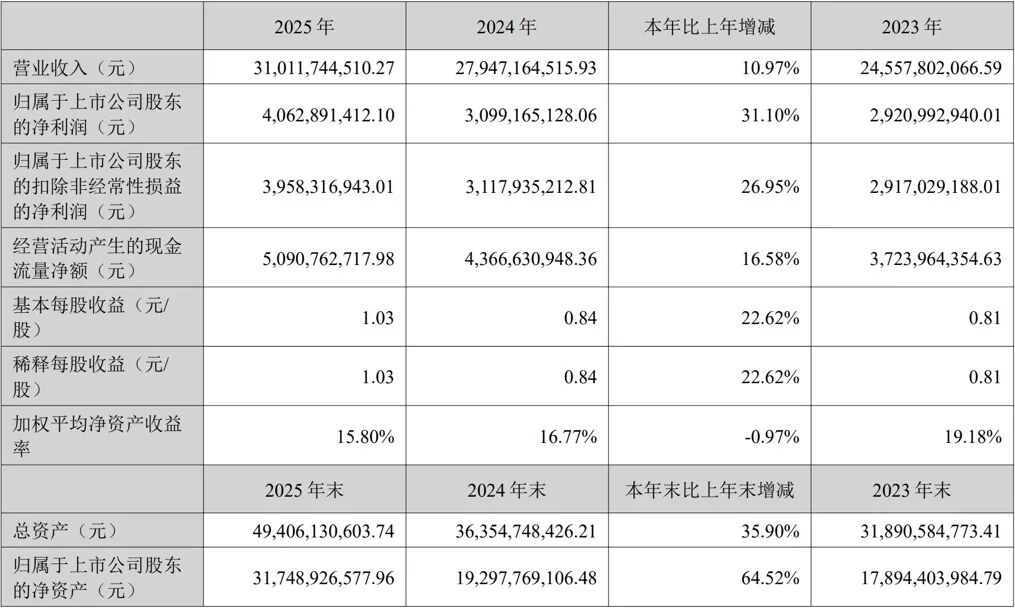 2025年全年,浙江三花智能控制股份有限公司(下称三花智控,002050.SZ,2050.HK)交出了一份稳健增长的成绩单。这一年,公司营业收入达到310.12亿元,较上年同期增长10.97%,归母净利润同比增长31.10%至40.63亿元;同期,公司扣非后归母净利润同比增长26.95%至39.58亿元,基本每股收益同比上升22.62%,为1.03元/股。
