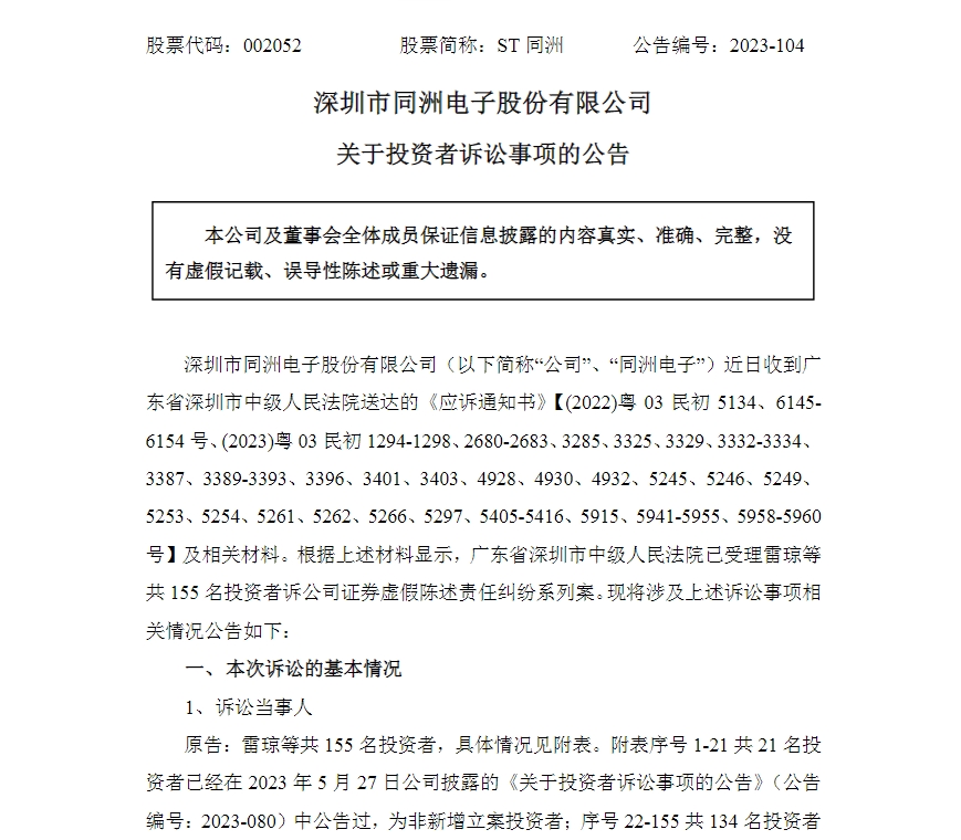 公告显示,诉讼当事人为原告雷琼等共155名投资者,其中序号1-21共21名投资者已经公告过,为非新增立案投资者,序号22-155共134名投资者为新增立案投资者,新增立案投资者索赔金额合计为25909350.278元。被告为深圳市同洲电子股份有限公司等。