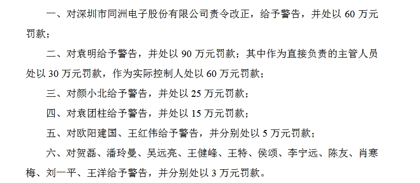 回溯往期公告,公司在2021年7月9日披露的关于收到行政处罚决定书的公告中显示,公司存在提前确认职工薪酬负债、滞后确认资产减值损失、虚构销售收入的违法事实,深圳证监局决定对深圳市同洲电子股份有限公司责令改正,给予警告,并处以60万元罚款;对相关责任人分别给予了警告并处以罚款。