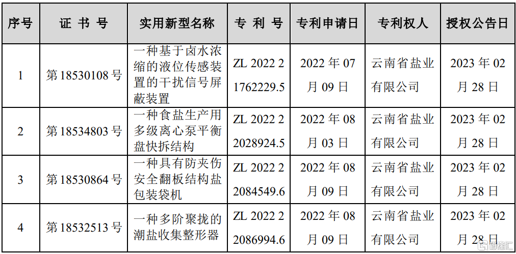 格隆汇3月2日丨云南能投(002053.SZ)公布,公司的全资子公司云南省盐业有限公司于日前收到国家知识产权局颁发的4项《实用新型专利证书》。