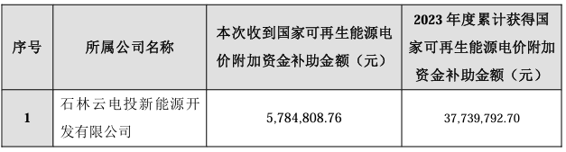 2024年1月3日,云南能投发布公告称,公司的全资子公司石林云电投新能源开发有限公司、会泽云能投新能源开发有限公司、马龙云能投新能源开发有限公司、大姚云能投新能源开发有限公司及控股子公司泸西县云能投风电开发有限公司于2023年12月29日、12月30日分别收到云南电网有限责任公司根据《财政部国家发展改革委国家能源局关于公布可再生能源电价附加资金补助目录(第一批至第七批)的通知》拨付的可再生能源电价附加资金补助合计32,393,462.83元。
