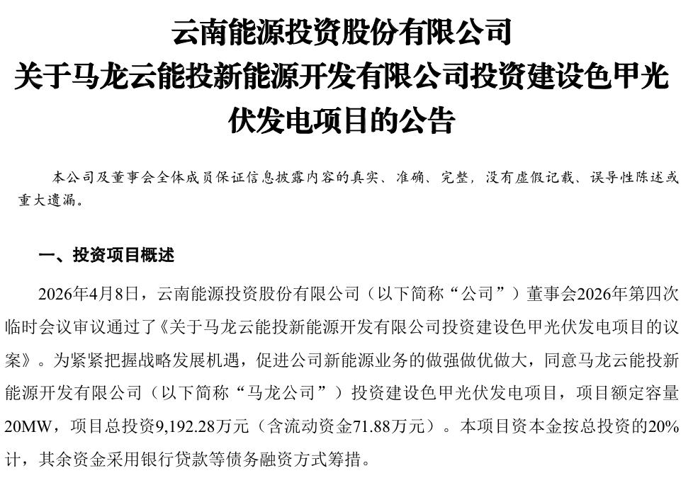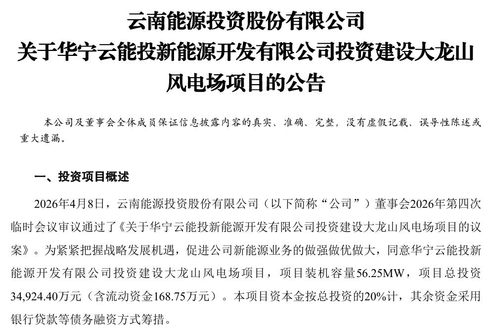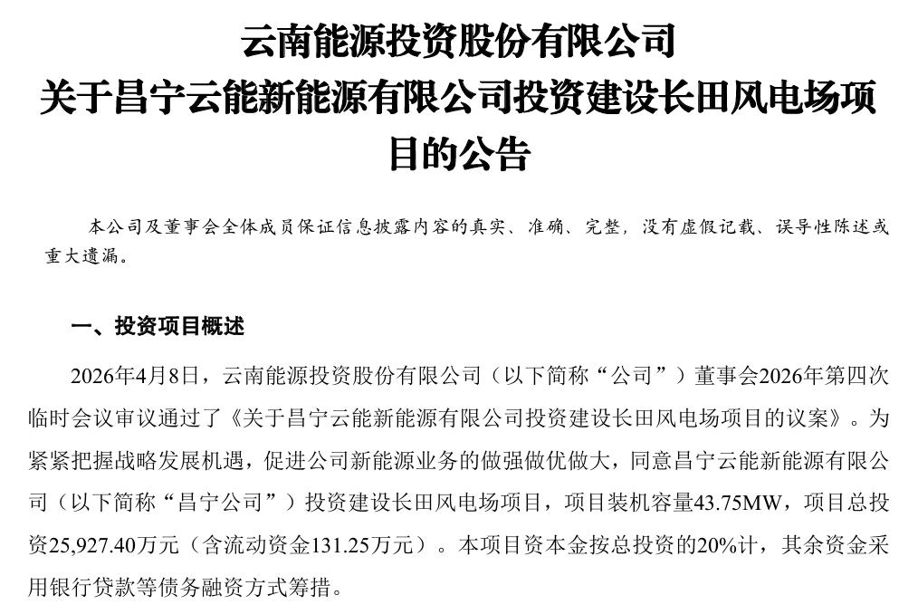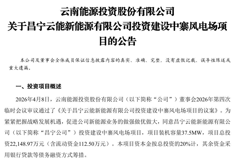 需要注意的是,云南能投在今日的公告中提示,本次计划投建的4个清洁能源项目尚需完成政府部门相关核准及审批手续,后续建设进度可能受政策调整、施工条件、并网消纳等因素影响。