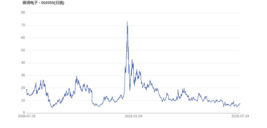 从上市首日至今,得润电子的市值实现了5.56倍的增长。2015年6月5日,得润电子的市值巅峰达到345.36亿元,股价也顺应升至76.66元。而至7月24日收盘,得润电子的股价为7.28元,市值为44.01亿元,相比峰值时期市值减少301.36亿元,市值蒸发了87.26%。