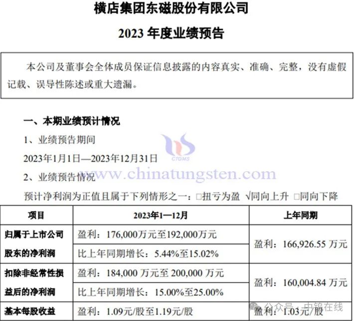 近期,稀土上市公司横店东磁发布公告称,公司预计2023年度实现归母净利润为176,000万元至192,000万元,与上年同期166,926.55万元相比,将增长5.44%至15.02%;实现扣非净利润为184,000万元至200,000万元,与上年同期160,004.84万元相比,将增长15.00%至25.00%;基本每股收益1.09元至1.19元。