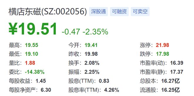 消息发出后,横店东磁的投资者坐不住了:12月25日,也就是今天当日,该股股价降了2.35个百分点,收盘价为19.51元每股。