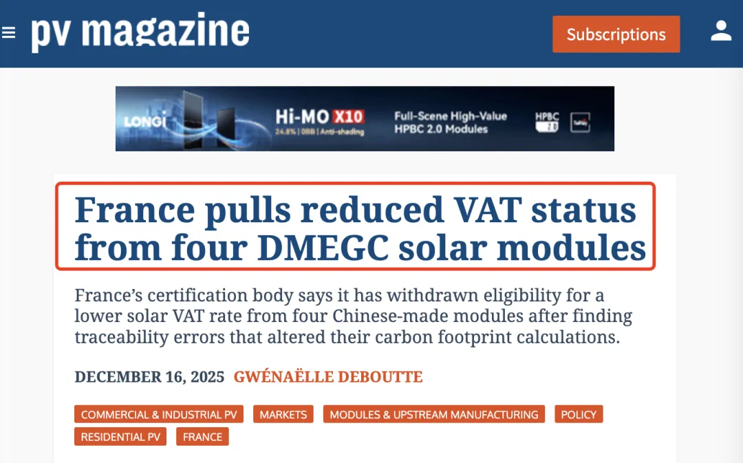 据pv magazine France报道,法国权威认证机构Certisolis不久前宣布,因溯源信息存在误差,取消了中国光伏制造商横店东磁(DMEGC)旗下四款太阳能组件享受5.5%优惠增值税税率的资格。