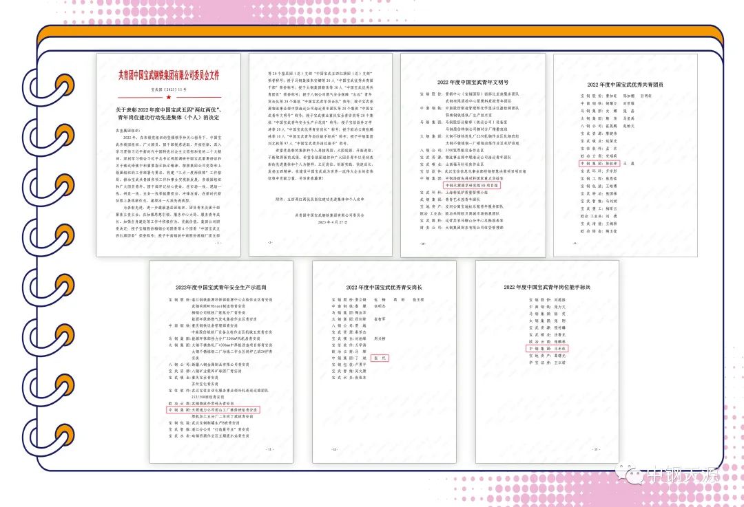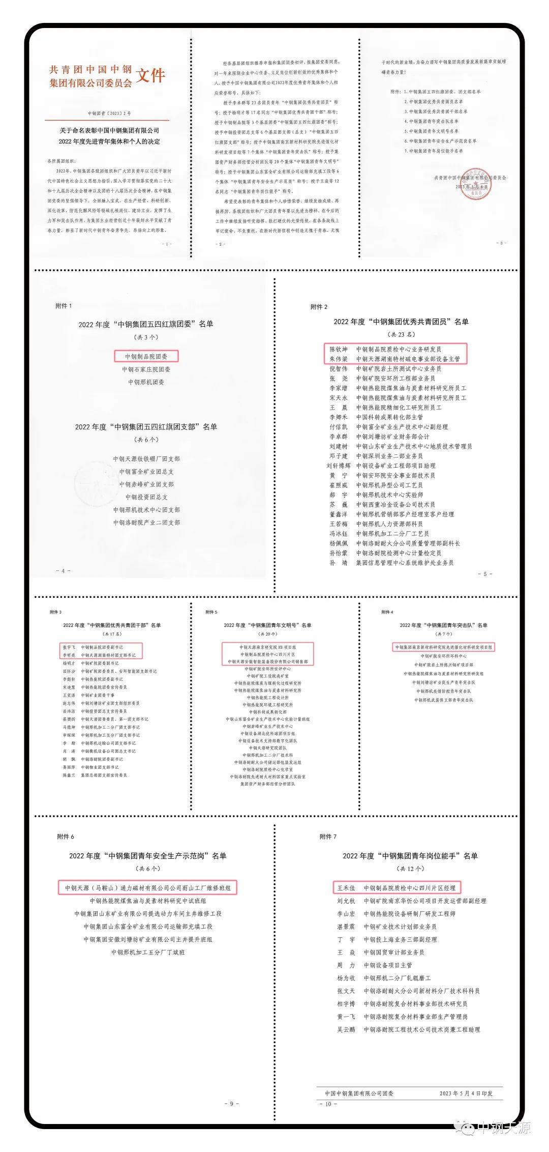 在中国宝武、中钢集团五四评选表彰中,南京研究院HS项目组获评“中国宝武青年文明号”、“中钢集团青年文明号”,通力公司雨山工厂维修班组青安岗荣获“中国宝武青年安全生产示范岗”、“中国集团青年安全生产示范岗”,通力公司张纪被授予“中国宝武优秀青安岗长”,中钢制品院王禾佳被授予“中国宝武青年岗位能手标兵”、“中钢集团青年岗位能手”,中钢制品院陈钦坤荣获“中国宝武优秀共青团员”,“中钢集团优秀共青团员”,中钢制品院团委、钕铁硼厂团支部分别获评“中钢集团五四红旗团委”、“中钢集团五四红旗团支部”,南京研究院先进催化材料研发项目组荣获“中钢集团青年突击队”,中钢制品院质检中心四川片区、天源装备销售部被授予“中钢集团青年文明号”,中钢制品院张宇飞、湖南特材李昕亮荣获“中钢集团优秀共青团干部”,湖南特材朱伟梁被授予“中钢集团优秀共青团员”荣誉称号。