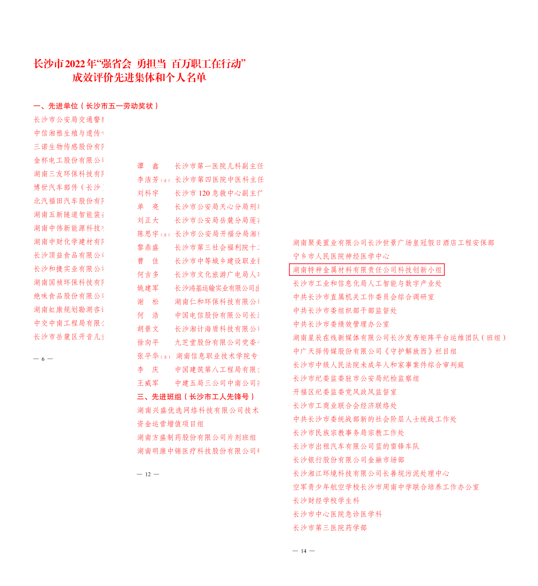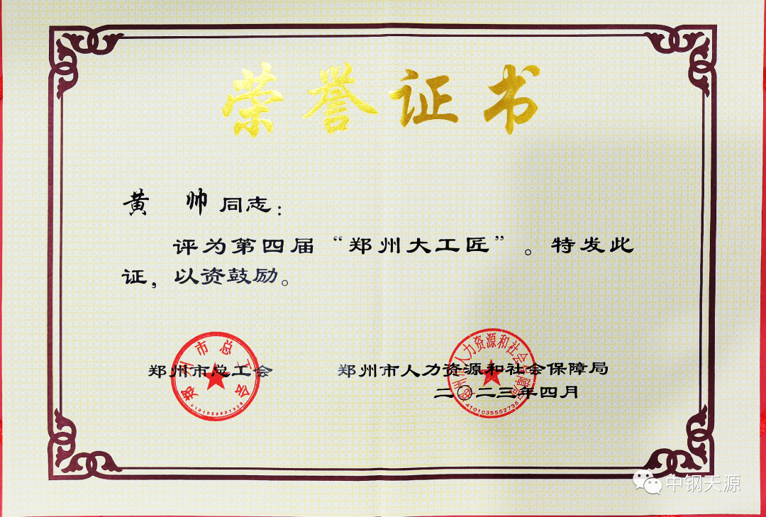 在地市级表彰中,中钢制品院黄帅被授予“郑州大工匠”、中钢制品院“国家金属制品质量检验检测中心”获评“郑州市青年五四奖章集体”,湖南特材科技创新小组荣获“长沙市工人先锋号”,通力公司舒云峰劳模工匠创新工作室获评“马鞍山市劳模工匠创新工作室”,磁材厂软磁车间、生产三班分别被授予“马鞍山市工人先锋号”、“马鞍山市‘安康杯’竞赛优胜班组”、天源装备王敏、磁材厂刘阿朋分获“马鞍山杰出工匠”、“马鞍山优秀工匠”,天源装备刘贞平荣获“马鞍山市五一劳动奖章”、“马鞍山市‘安康杯’竞赛先进个人”,钕铁硼厂张华宁被授予“马鞍山市职工技术能手”荣誉称号。