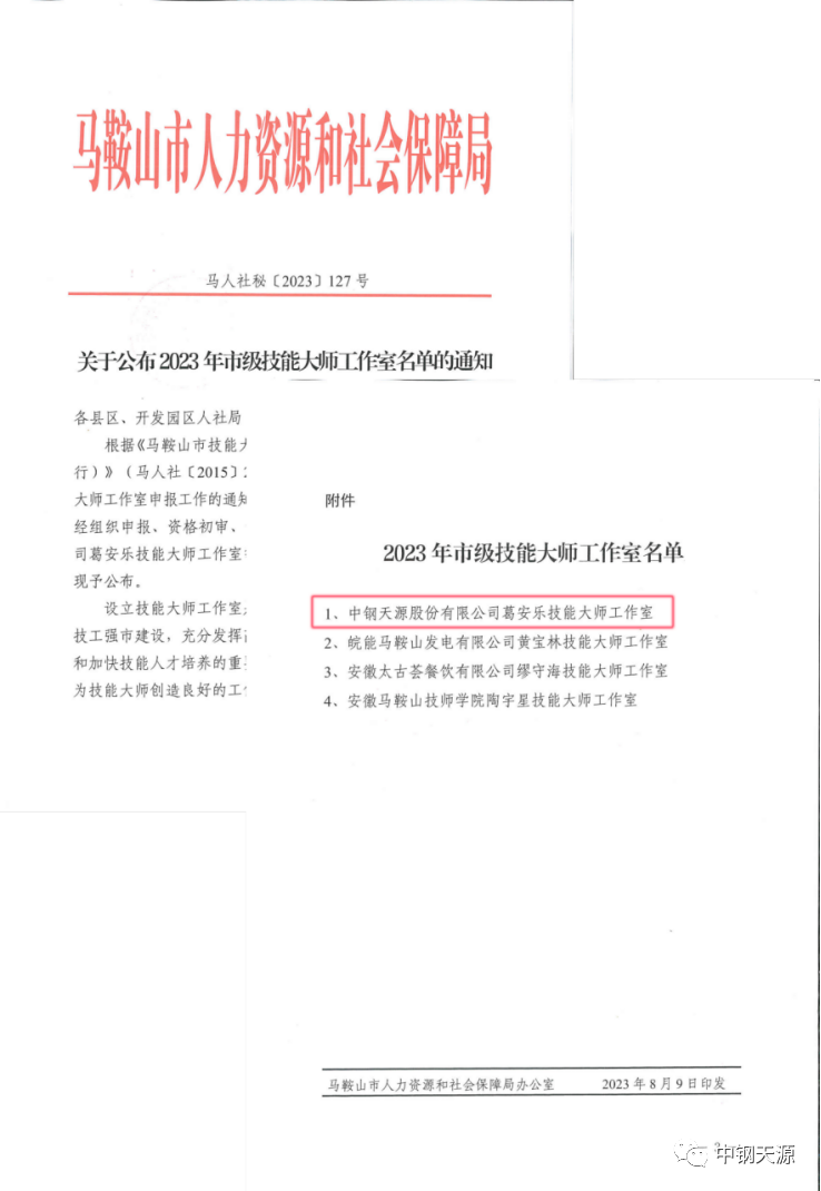 近日,马鞍山市人力资源和社会保障局发文公布2023年市级技能大师工作室名单,中钢天源葛安乐技能大师工作室(电工)获评“市级技能大师工作室”。