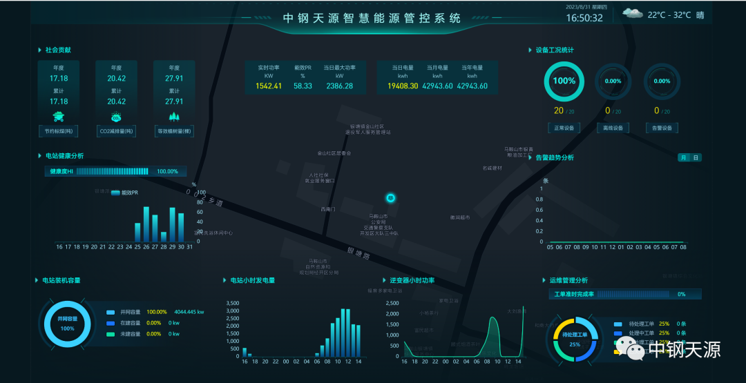 项目采取“自发自用,余电上网”方式,在中钢天源产业园约5万平方米的厂房屋顶布置太阳能光伏板。为确保该项目早日投产运行,今年年初春节放假刚结束,相关人员就紧锣密鼓督促和推进项目建设,从2月6日正式开工起,经承重评估、加固方案设计和改造、电缆铺设、光伏板安装、电站建设等关键环节,历时约半年完成项目建设,经供电部门专项验收后正式投入运行。项目投用后预计总发电量约1亿度,减少碳排放量107175t,替代标准煤39200t,节能和环保效益明显。