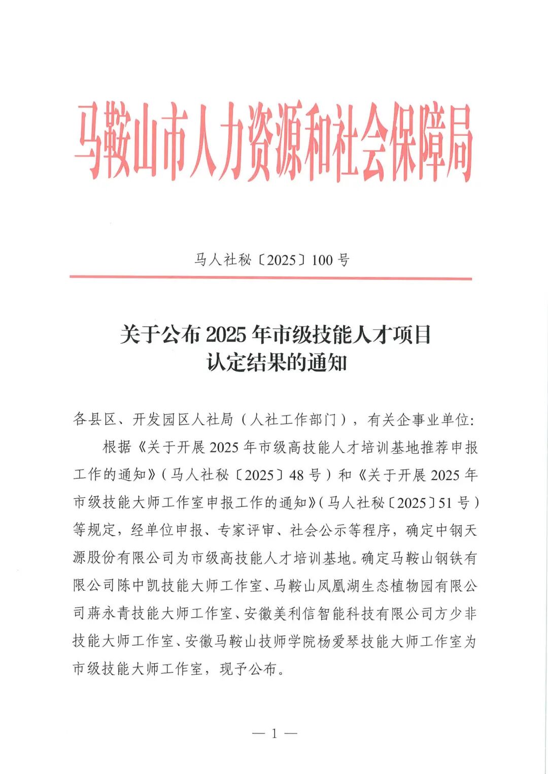 近日,马鞍山市人力资源和社会保障局公布2025年市级技能人才项目认定结果,中钢天源成功获评“市级高技能人才培训基地”。此次认定全市仅1家企业入选,既是地方政府对公司技能人才培养工作的认可,也是中钢天源践行人才强企战略、深化产业工人队伍建设的生动实践。