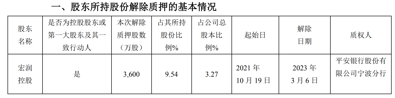 宏润建设近日接到公司控股股东浙江宏润控股有限公司(以下简称“宏润控股”)函告,获悉宏润控股所持公司的3600万股股份解除质押,占宏润建设总股本比例为3.27%。