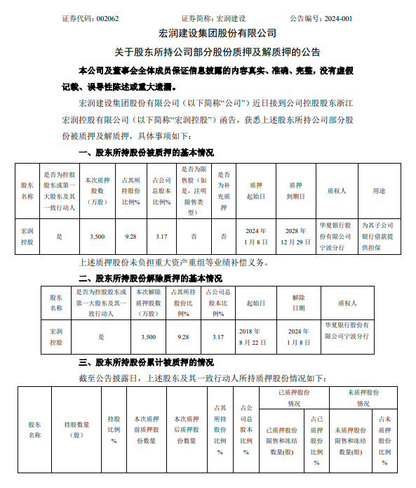 1月10日,宏润建设集团股份有限公司(简称:宏润建设)发布了关于股东所持公司部分股份质押及解质押的公告。公告称,公司近日接到公司控股股东浙江宏润控股有限公司(简称“宏润控股”)函告,获悉上述股东所持公司3500万股股份被质押及解质押,上述股份占公司总股本比例3.17%。