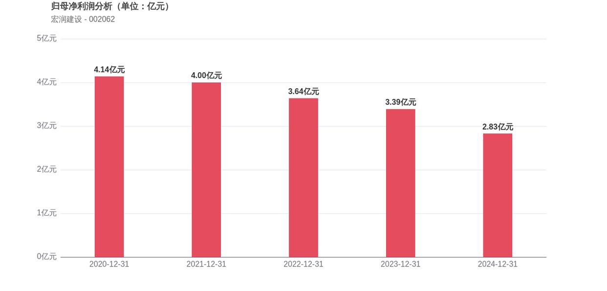 利润角度分析,2020年宏润建设实现归母净利润4.14亿元,2024年2.83亿元。盈利能力出现一定程度的回落。