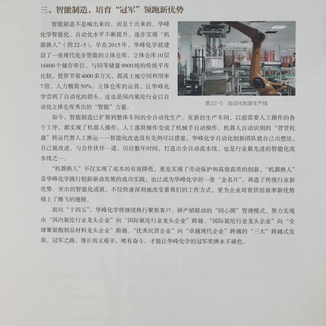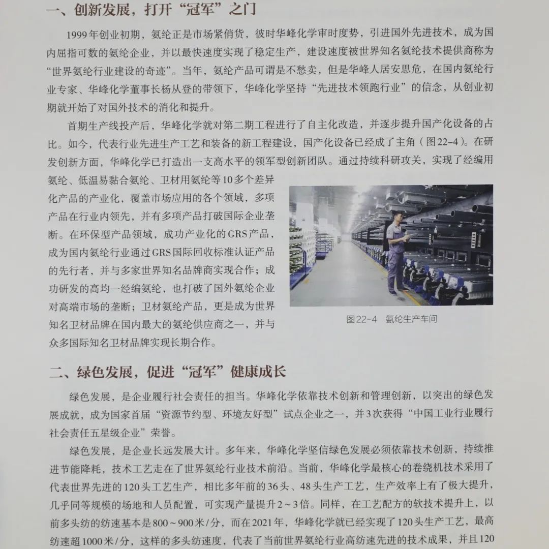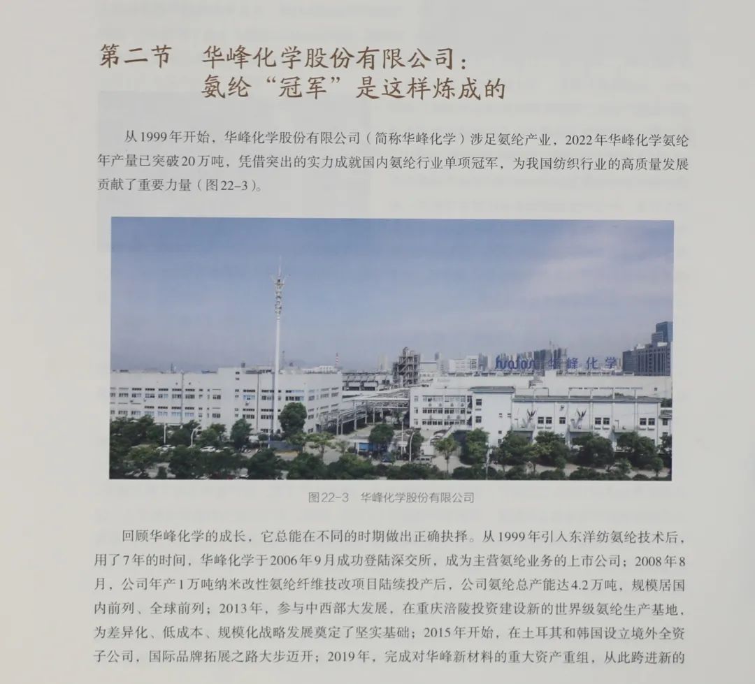 《中国化纤简史》是“十四五”国家重点图书出版规划项目。该书是一部中国化学纤维工业的发展史,全面、系统地记载了1949年以来,中国化学纤维工业的发展历程及行业大事件。华峰化学是全国氨纶行业两家入编企业之一,入编该书,再次树立了华峰化学在行业的良好形象。