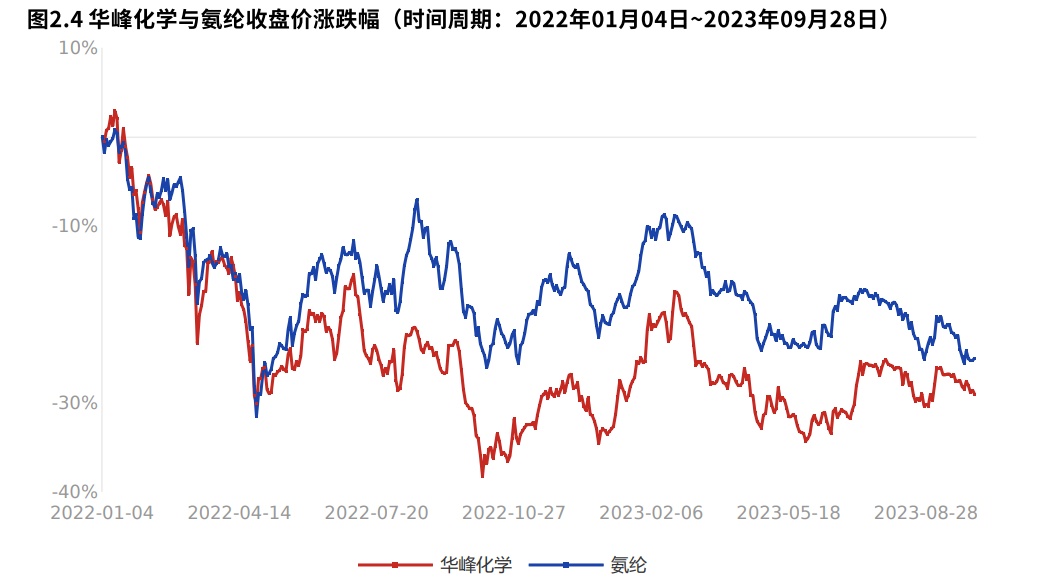 2022年01月04日到2023年09月28日,公司收盘价涨跌幅-29.05%,沪深300指数涨跌幅-24.98%,氨纶涨跌幅-24.95%。
