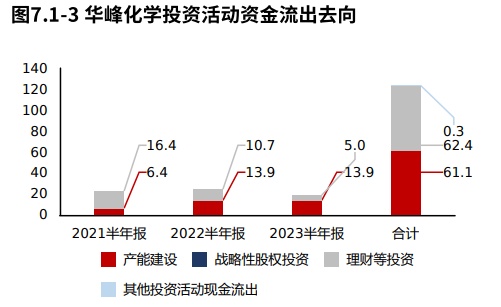 华峰化学2023半年报的投资活动资金流出,产能建设占比最大,占比73.38%。华峰化学2021年报到本期的投资活动资金流出,理财等投资占比最大,占比50.42%,此外产能建设也占比较大。