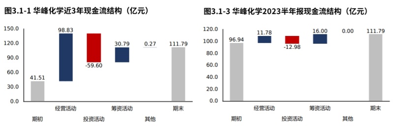 从华峰化学2021年报到本期的现金流结构来看,期初现金41.51亿元,经营活动净流入98.83亿元,投资活动净流出59.60亿元,筹资活动净流入30.79亿元,其他现金净流入0.27亿元,三年累计净流入70.28亿元,期末现金111.79亿元。
