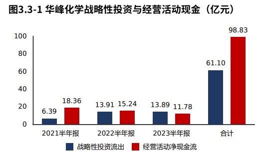 华峰化学2021年报到本期战略投资资金流出61.10亿元,经营活动产生现金净流入98.83亿元,经营活动的造血能力能够覆盖战略投资的资金流出。泰和新材(002254)2021年报到本期战略投资资金流出33.20亿元。