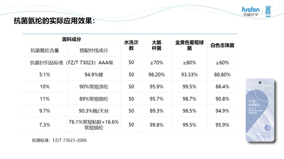 应用场景的增加、需求量的增大都使得整个行业的产品开发呈现前所未有的繁荣。华峰化学作为领军企业近年来不断加大产品研发力度,孙律平说,“在氨纶这一赛道,华峰化学始终坚持‘先进技术领跑行业’的理念,持续科研攻关,实现了超耐氯、抗菌、酸性可染、黑色等千禧?功能性差别化系列氨纶的产业化,并致力于将差别化做成规模化,让功能性成为氨纶的基本特性,以满足面料创新对氨纶更高的要求。例如,千禧?抗菌氨纶通过分子设计以及添加剂筛选,在氨纶分子中首次引入新型广谱抗菌剂,纤维产品抗菌性能优异、抗菌菌谱宽、耐水洗性能优异。同时,采用千禧?抗菌氨纶可实现高性价比,如‘10%千禧?抗菌氨纶+90%常规涤纶’的面料与‘10%常规氨纶+90%抗菌涤纶’的面料均可满足消费者抗菌需求,但前者可降低5%以上的材料成本。”