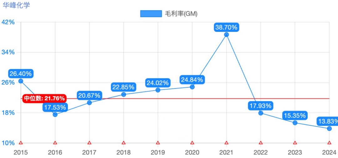 净利润下降的同时,公司的毛利率也不容乐观。自2021年达到顶峰38.70%之后,2022年—2024年毛利率分别为17.93%,15.35%以及13.83%,呈下降趋势。