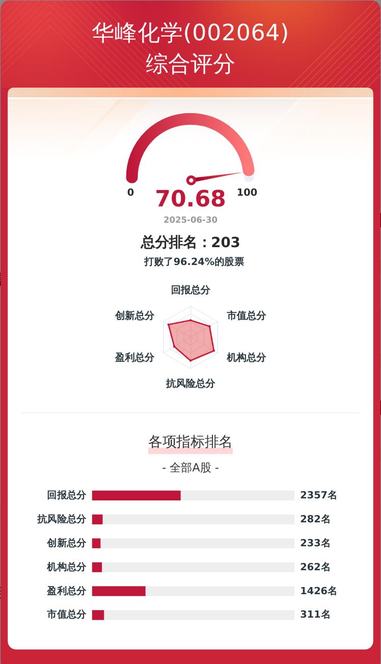金融界上市公司研究院构建了一套上市公司韧性评价体系,从企业盈利、科技创新、股东回报、经营抗风险、市值表现及机构吸引力六个维度对企业进行量化评分,满分为100分。华峰化学的韧性评价总分为70.68分,在A股5405家可比上市公司中排名第203位。