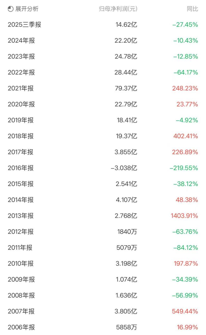如今,受行业产能过剩影响, 华峰化学 业绩已连续多年承压。2022年至2025年前三季度,公司分别实现净利润28.44亿元、24.78亿元、22.20亿元、14.62亿元,分别下降64.17%、12.85%、10.43%、27.45%。