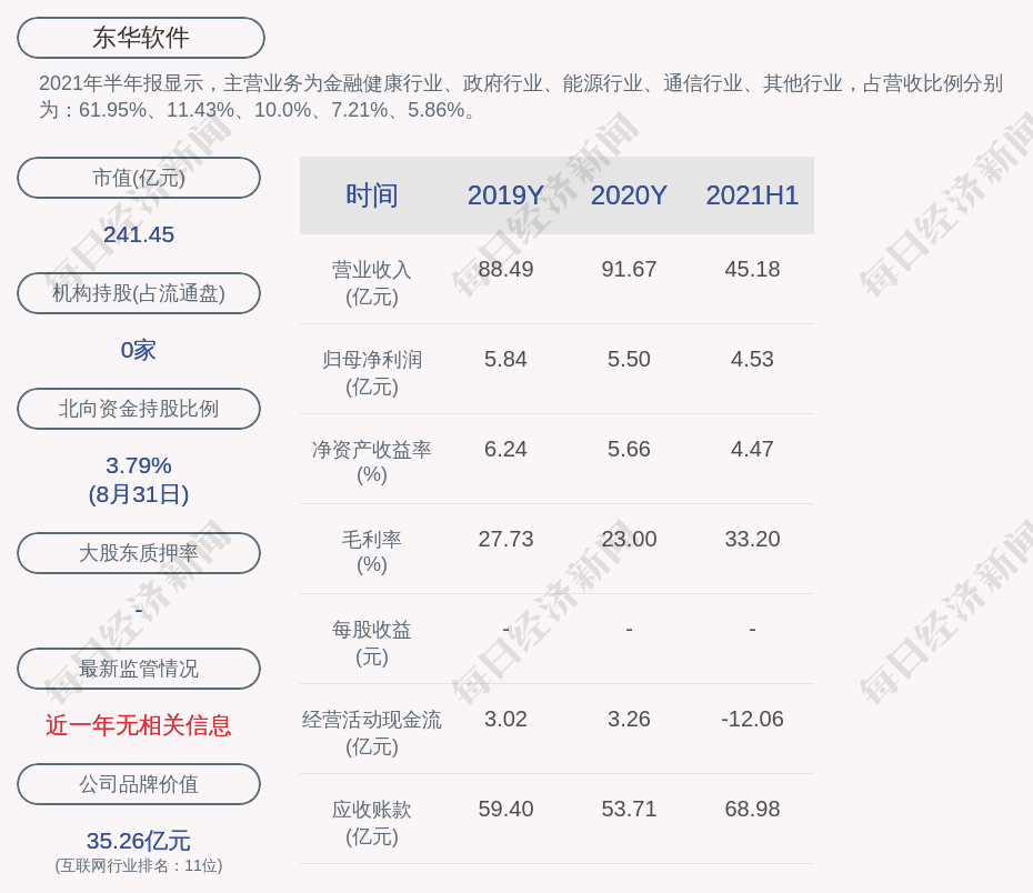 2021年半年报显示,东华软件的主营业务为金融健康行业、政府行业、能源行业、通信行业、其他行业,占营收比例分别为:61.95%、11.43%、10.0%、7.21%、5.86%。