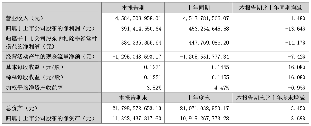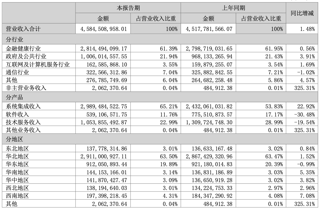 2022年8月24日,东华软件发布的《2022年半年度报告》显示:营收 45.85 亿,去年同期 45.18 亿;净利润 3.91 亿,去年同期 4.53 亿。
