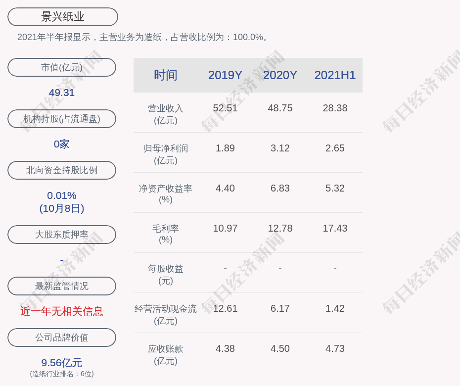 2021年半年报显示,景兴纸业的主营业务为造纸,占营收比例为:100.0%。