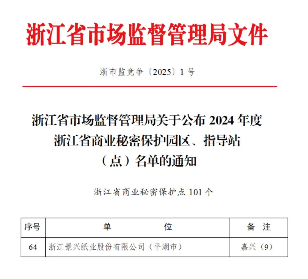 近日,浙江省市场监督管理局揭晓2024年度浙江省商业秘密保护园区、指导站(点)的名单,浙江景兴纸业股份有限公司凭借其出色的商业秘密保护工作,成功跻身榜单,成为平湖市独揽此殊荣的佼佼者。
