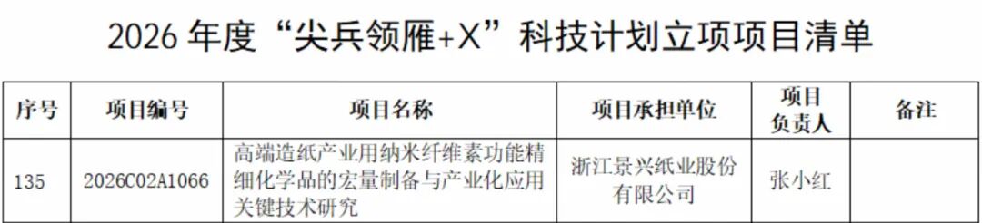 2025年12月30日,经过严格筛选,浙江省科学技术厅下达了2026年度“尖兵领雁+X”科技计划项目,景兴纸业承担的“高端造纸产业用纳米纤维素功能精细化学品的宏量制备与产业化应用关键技术研究”项目(编号:2026C02A1066)获批“领雁”项目。