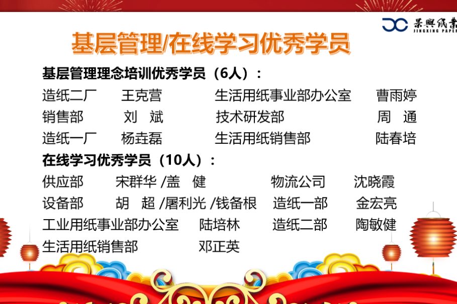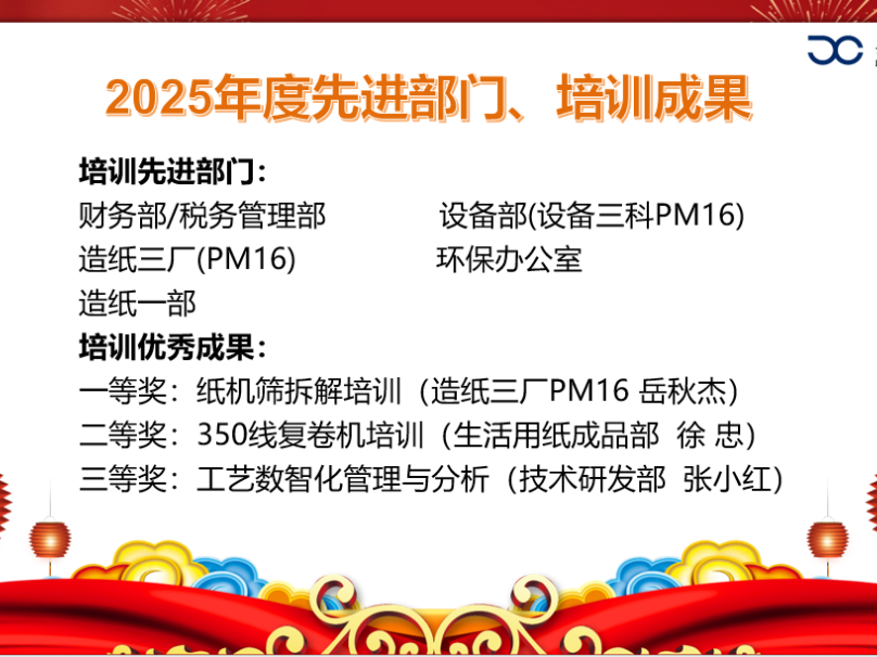 技术研发部的徐清凉、生活用纸成品部的董洪波、造纸三厂的岳秋杰分别围绕本部门年度最具代表性的专项培训成果进行了生动详实的汇报,充分展现了培训工作与业务攻坚、技能提升紧密结合的特色亮点。
