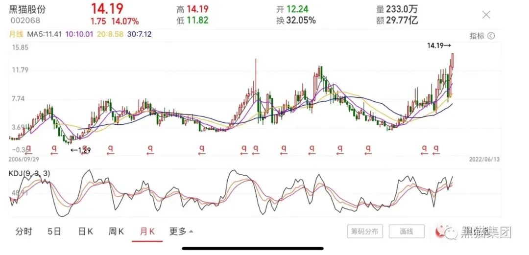 6月13日股市开盘后不久,江西黑猫炭黑股份有限公司(以下简称“黑猫股份”)股价大涨。截至6月13日收盘,黑猫股份上涨10.00%,报收14.19元/股,总市值达106亿元,创下历史新高。