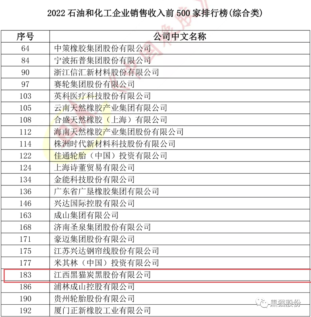 11月30日,由中国石油和化学工业联合会、中国化工企业管理协会主办的2022年石油和化工企业销售收入前500家发布会暨加快建设世界一流企业高峰论坛在北京举行。榜单显示,江西黑猫炭黑股份有限公司成功上榜“2022年石油和化工企业销售收入前500家排行榜”,综合类企业榜单第183名,相较去年排名提升五名。