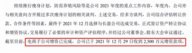 獐子岛集团旗下的电商公司获得了其他企业的青睐,大连长盈海洋牧场有限公司(对,又是这家公司)增加了对獐子岛电商公司的投资,于2021年12月29日注资2500万元让獐子岛归属于母公司的净资产在年底由负转正。