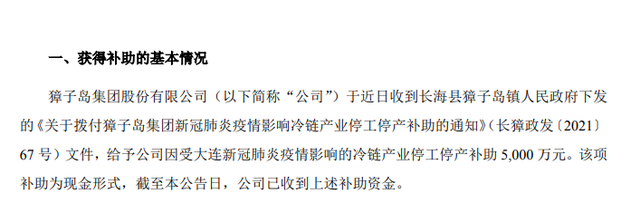 2022年1月4日,獐子岛公告收到了因受大连新冠肺炎疫情影响的停工停产补助5000万元,全部以现金形式发放。