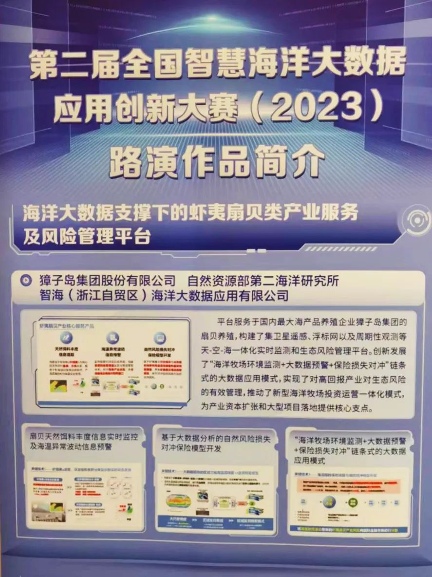 近日,第二届全国智慧海洋大数据应用创新大赛(2023)成果路演在天津成功举办。10支参赛队伍经过激烈角逐,最终各奖项逐一揭晓,獐子岛集团股份有限公司联合自然资源部第二海洋研究所、智海(浙江自贸区)海洋大数据应用有限公司的参赛作品——“海洋大数据支撑下的虾夷扇贝类产业服务及风险管理平台”荣获大赛一等奖。