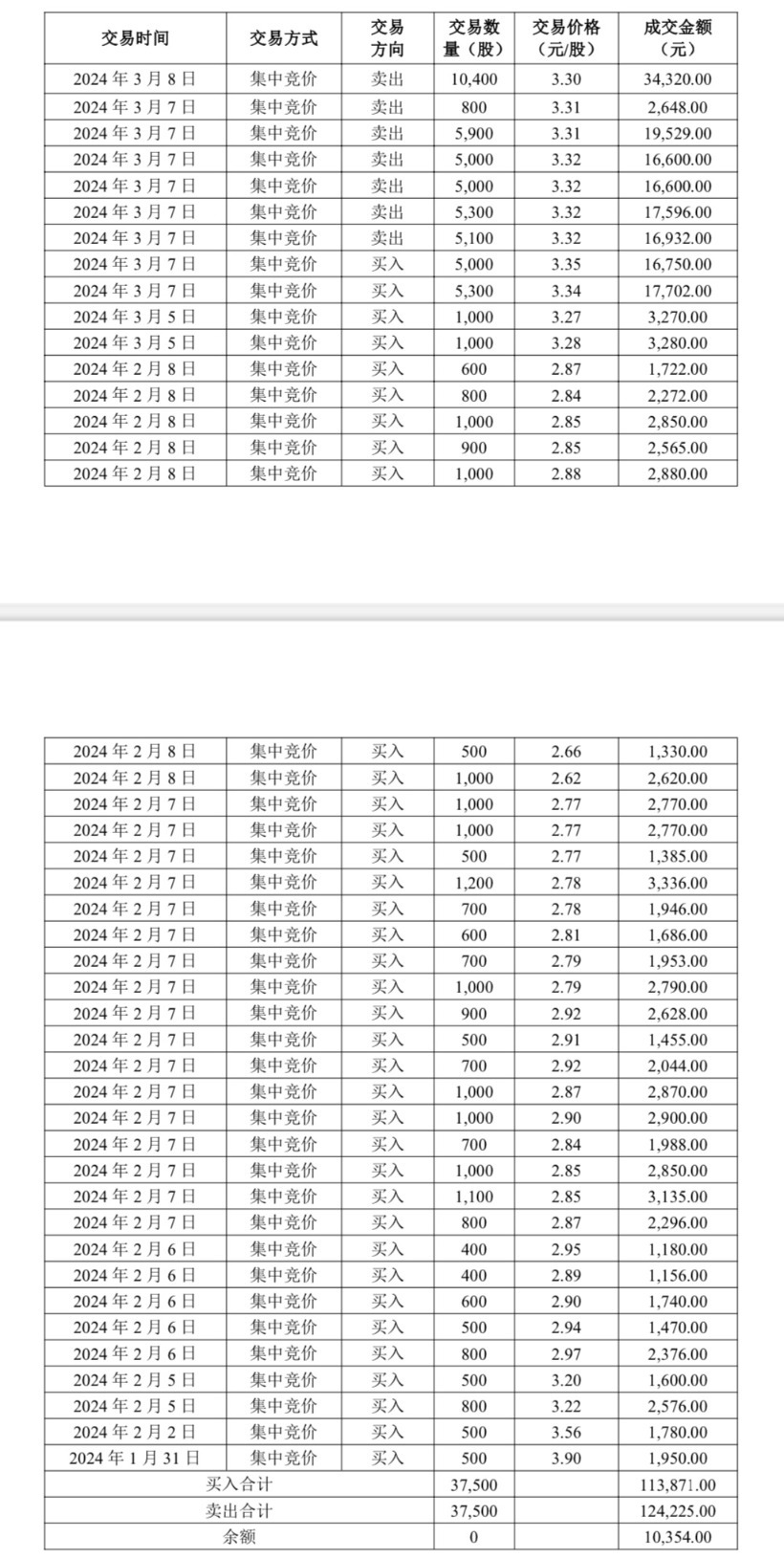 3月7日、8日两天,许宁开始作出卖出动作,两天时间清仓上述股票,成交金额合计124225元。獐子岛在公告中称,截至2024年3月8日,许宁及姜云全家庭成员不再持有獐子岛股票。买卖之间,许宁产生的收益为10354元。