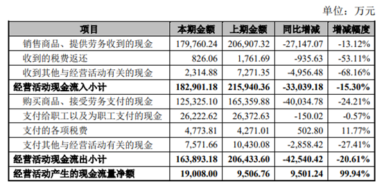 整体来看,“虽然公司报告期内营业收入有所下降、经营活动现金流入同比减少33039.18万元,但经营活动现金流出同比减少42540.42万元,因此经营活动产生的现金流量净额同比上升9501.24万元。”