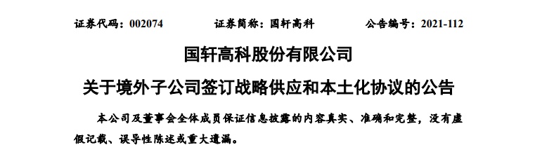 12月20日,国轩高科(002074)发布公告称,孙公司美国国轩与一家美国大型上市车企签署《战略供应和本土化协议》,双方希望在磷酸铁锂电池(以下简称“LFP 电池”)的供应和采购方面达成战略合作。